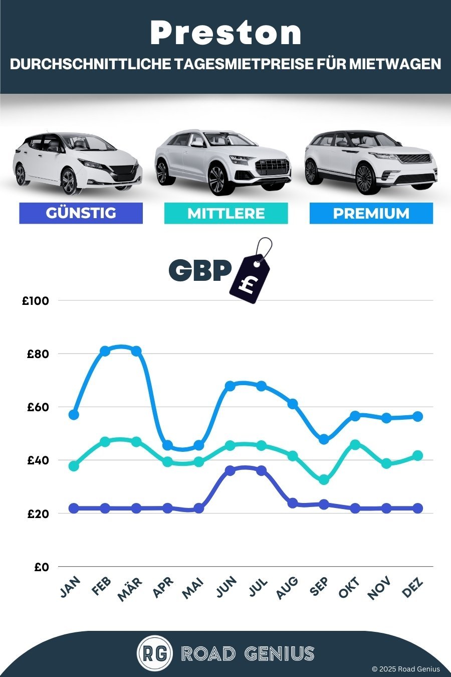 Im Durchschnitt kosten Mietwagen in Preston etwa 42 € pro Tag, wobei die günstigsten Angebote bereits ab 22 € pro Tag verfügbar sind.