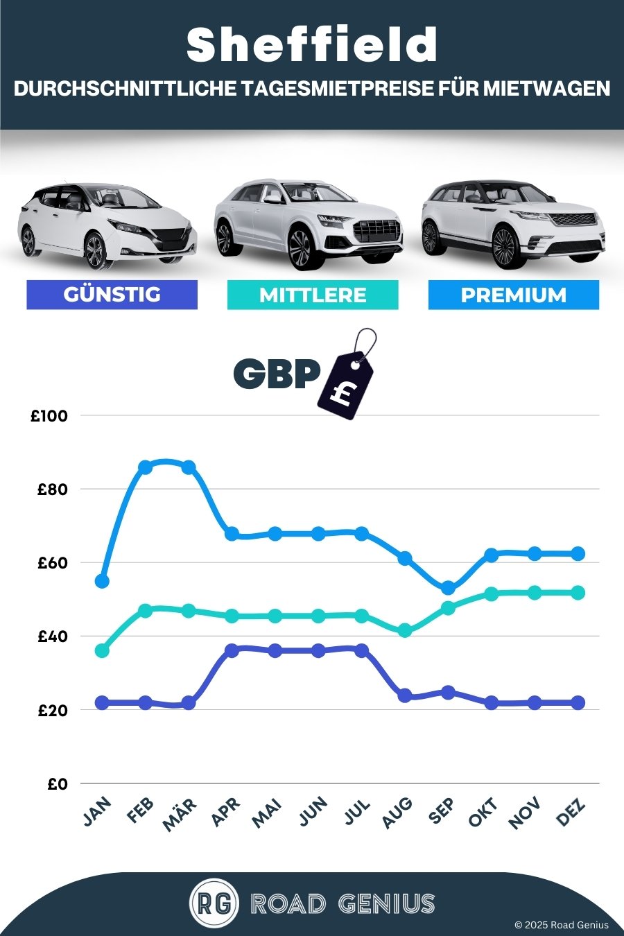 Im Durchschnitt kosten Mietwagen in Sheffield etwa 47 € pro Tag, wobei die günstigsten Angebote bereits ab 22 € pro Tag verfügbar sind.