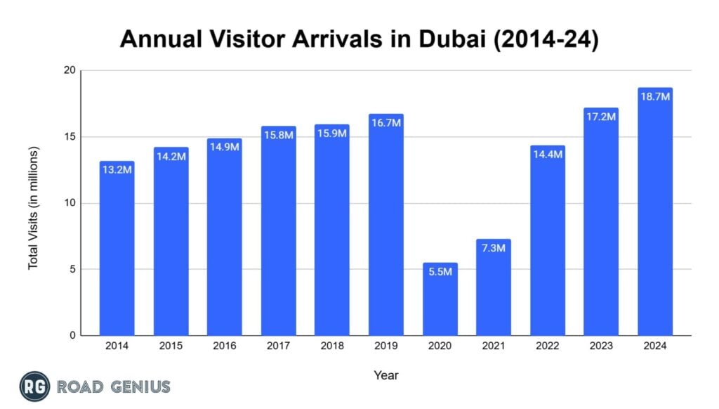- Dubai welcomed 13.2 million visitors in 2014, with steady growth observed through 2019, peaking at 16.7 million visitors, a growth of 26.5% over five years.1
