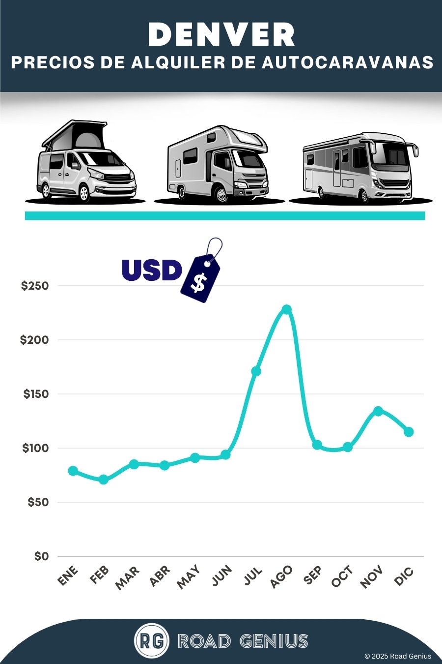Los precios de alquiler de vehículos recreativos en Denver dependen de varios factores, como el tamaño del vehículo, la edad, las características, la duración de la reserva, la temporada y los lugares de recogida y devolución.