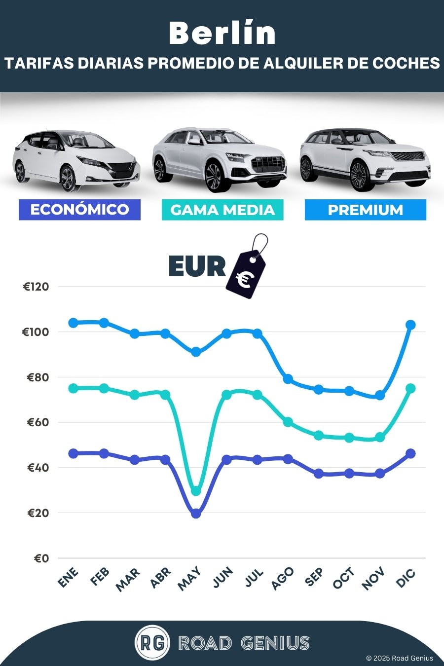 De media, el alquiler de coches en Berlín cuesta alrededor de €65 al día, con los alquileres más baratos disponibles desde €20 al día.