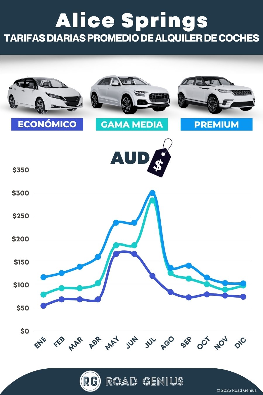 En promedio, el alquiler de coches en Alice Springs cuesta alrededor de AUD $116 al día, con las tarifas más bajas a partir de AUD $69 al día.