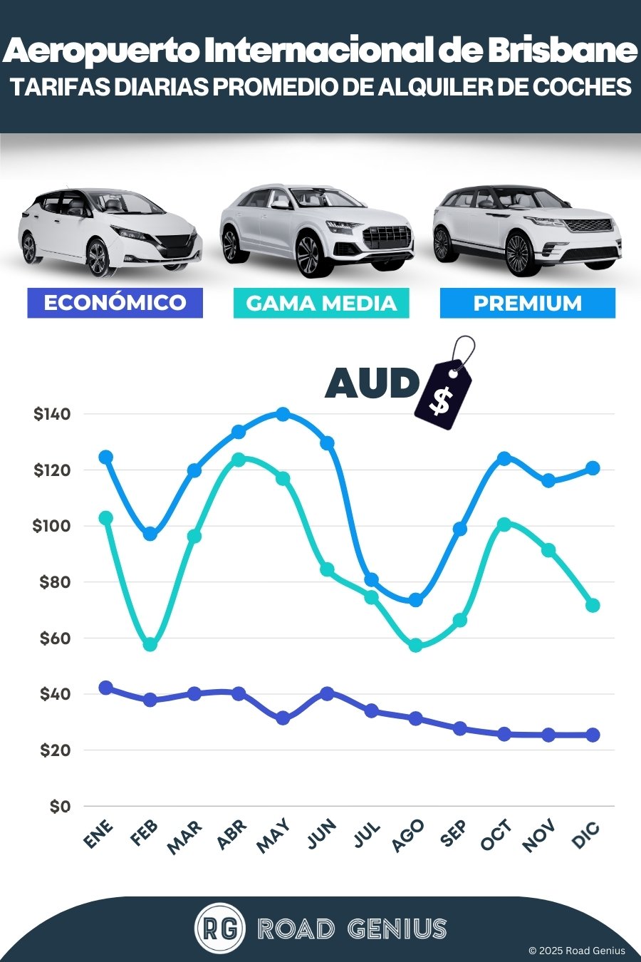 En promedio, el alquiler de coches en el Aeropuerto de Brisbane (BNE) cuesta alrededor de AUD $103 al día, con los precios más bajos disponibles desde AUD $25 al día.