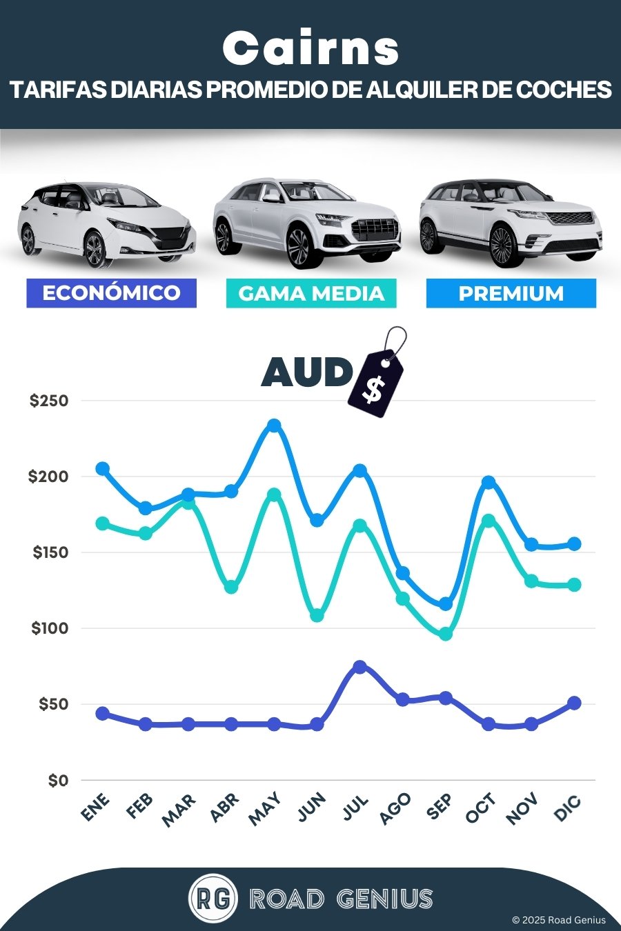 En promedio, el alquiler de coches en Cairns cuesta alrededor de AUD $157 por día, con los alquileres más baratos disponibles desde AUD $37 por día.
