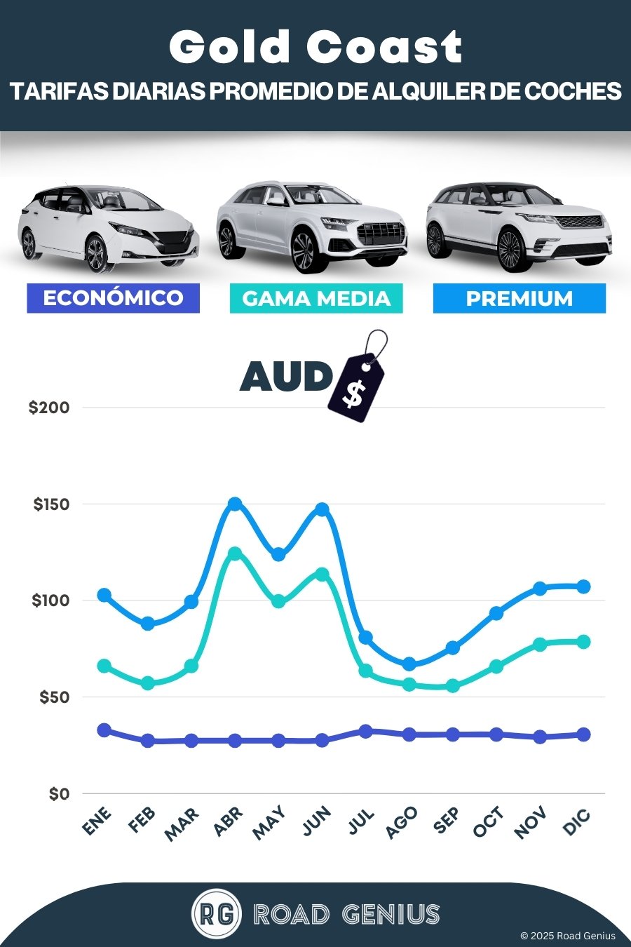 En promedio, el alquiler de coches en Gold Coast cuesta alrededor de AUD $91 al día, con los más baratos disponibles desde AUD $27 al día.