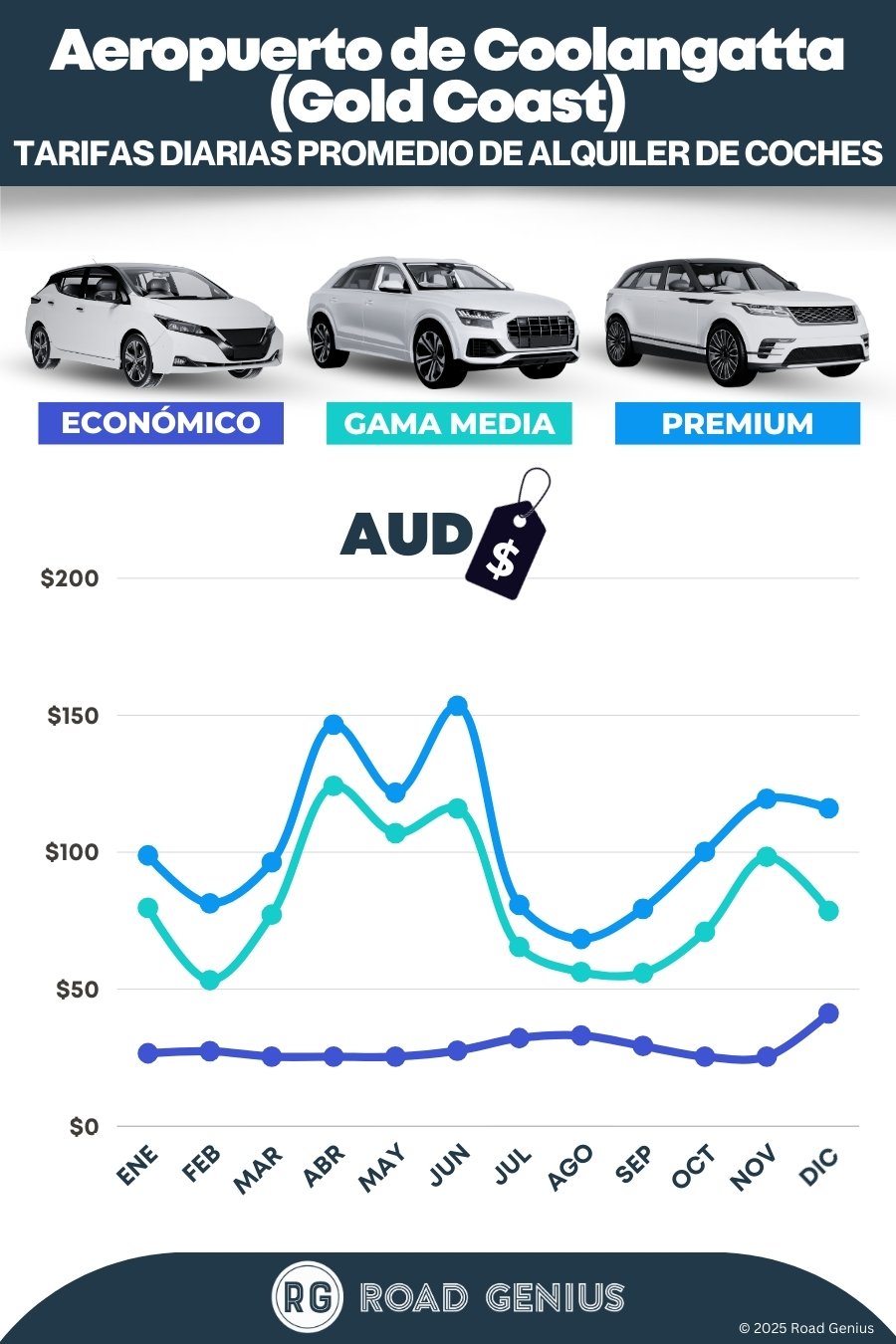En promedio, el alquiler de coches en el Aeropuerto de Gold Coast (OOL) cuesta alrededor de AUD $93 al día, con los alquileres más baratos disponibles desde AUD $25 al día.