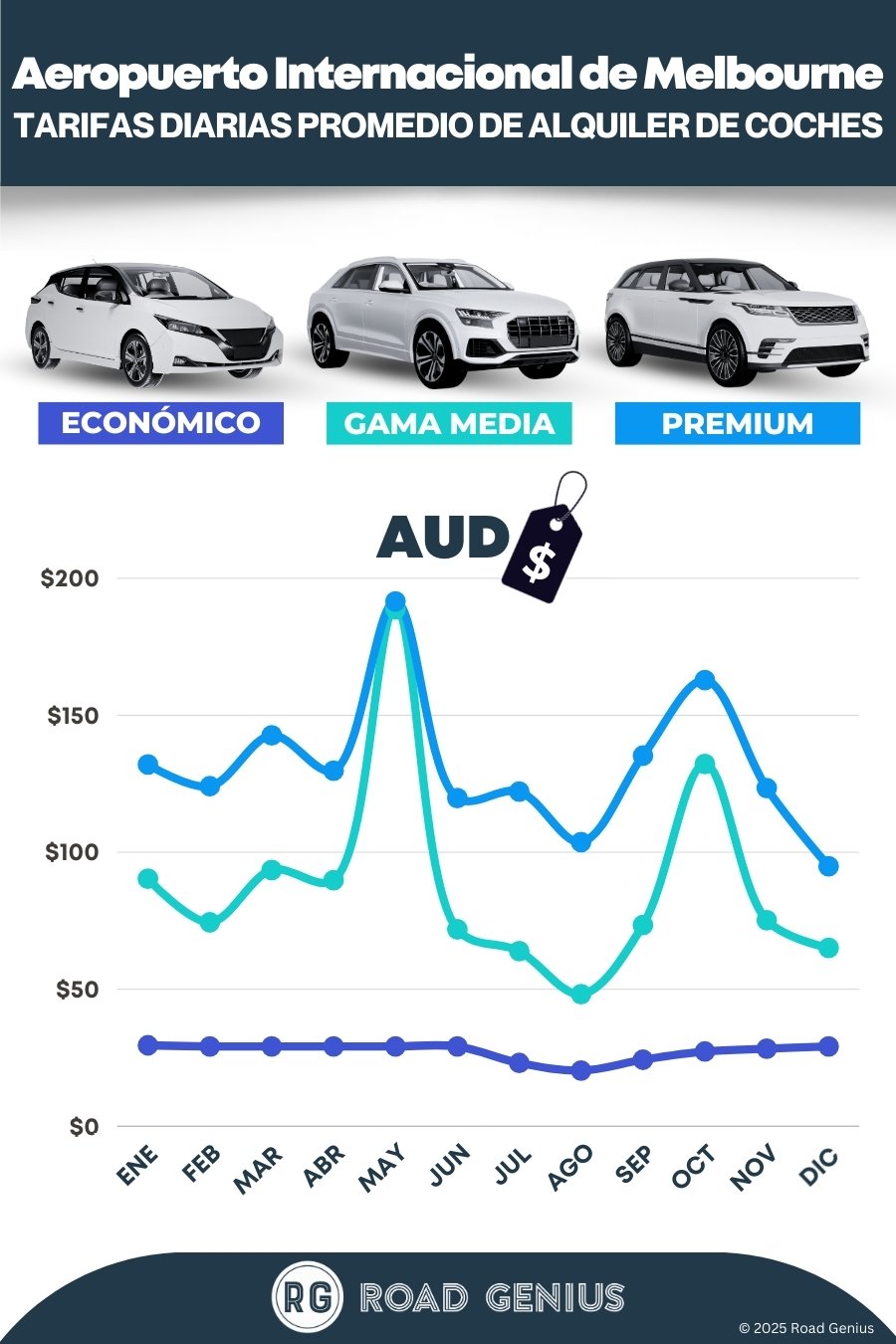 En promedio, el alquiler de coches en el Aeropuerto de Melbourne (MEL) cuesta alrededor de AUD $111 por día, con los más baratos disponibles desde AUD $20 por día.