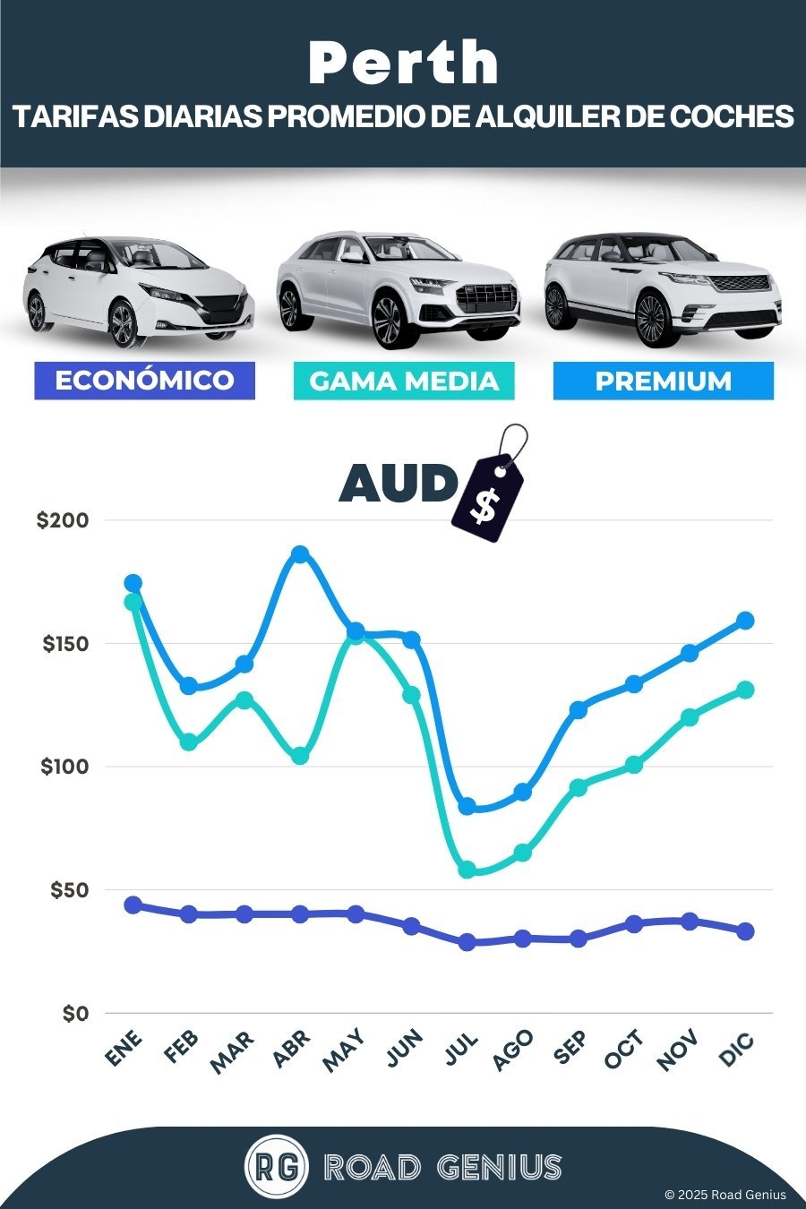 En promedio, el alquiler de coches en Perth cuesta alrededor de AUD $122 por día, con precios mínimos disponibles desde AUD $29 por día.