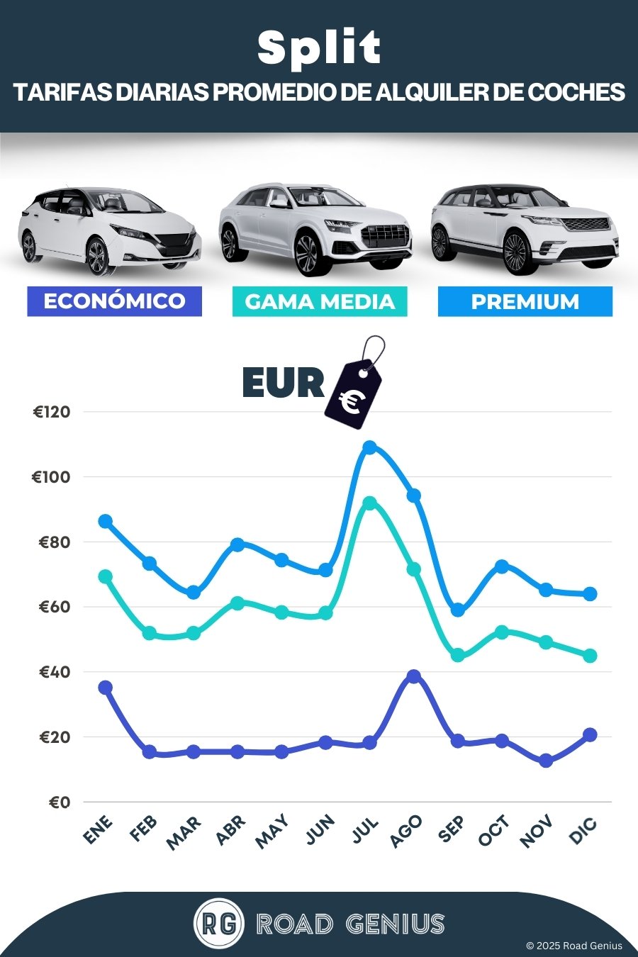 De media, el alquiler de coches en Split cuesta alrededor de €52 al día, con los alquileres más baratos disponibles desde €13 al día.