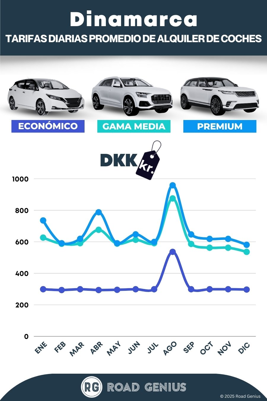 De media, el alquiler de coches en Dinamarca cuesta alrededor de 533 kr al día, con los alquileres más baratos disponibles desde 294 kr al día.