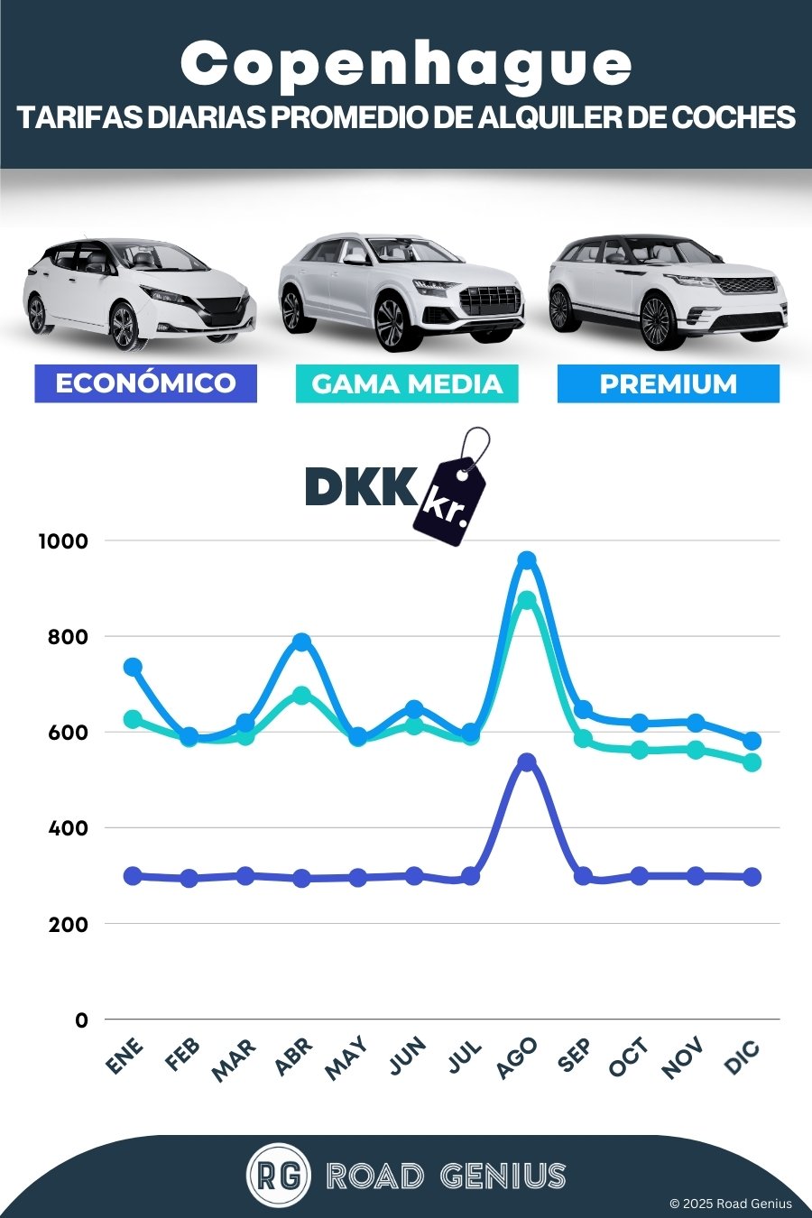 De media, el alquiler de coches en Copenhague cuesta alrededor de 533 kr al día, con los alquileres más baratos disponibles desde 294 kr al día.