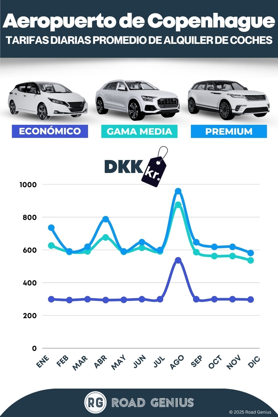 De media, el alquiler de coches en el Aeropuerto de Copenhague cuesta alrededor de 533 kr al día, con los alquileres más baratos disponibles desde 294 kr al día.