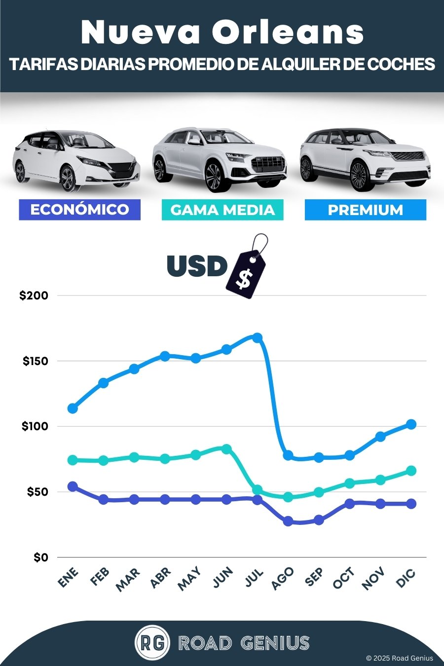 De media, el alquiler de coches en Nueva Orleans cuesta alrededor de 76 USD al día, con los alquileres más baratos disponibles desde 28 USD al día.