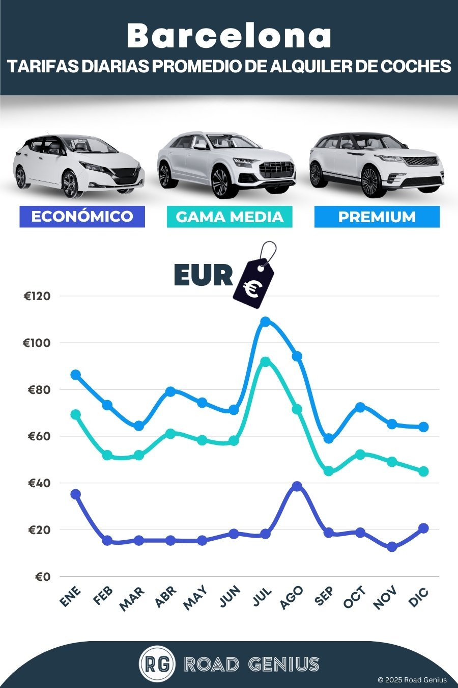 De media, el alquiler de coches en Barcelona cuesta alrededor de €52 al día, con los alquileres más baratos disponibles desde €13 al día.