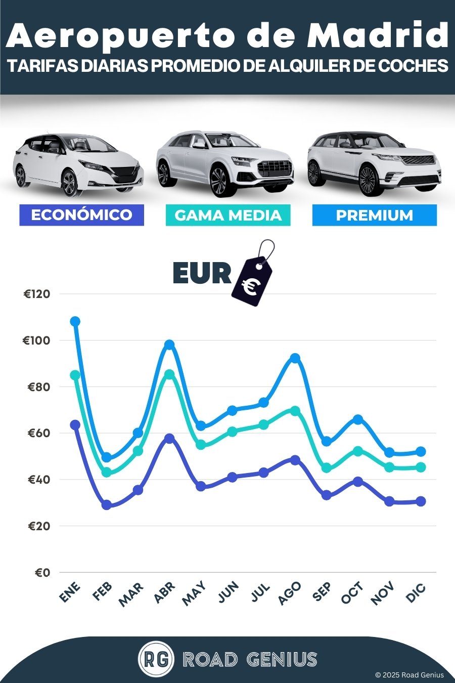 De media, el alquiler de coches en el Aeropuerto de Madrid cuesta alrededor de €56 al día, con los alquileres más baratos disponibles desde €29 al día.