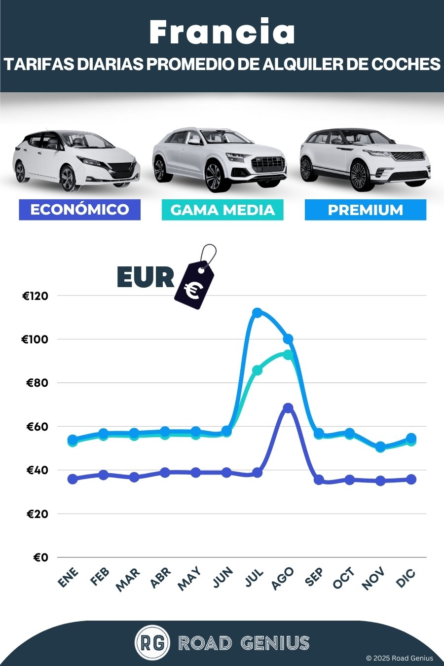 De media, el alquiler de coches en Francia cuesta alrededor de €55 al día, con los alquileres más baratos disponibles desde €35 al día.