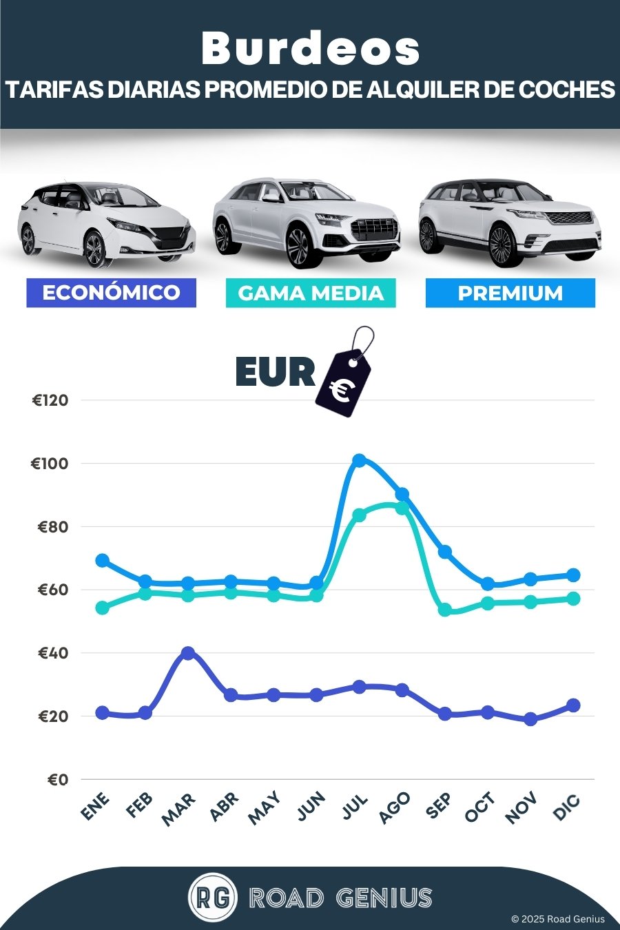 De media, el alquiler de coches en Burdeos cuesta alrededor de €52 al día, con los alquileres más baratos disponibles desde €19 al día.