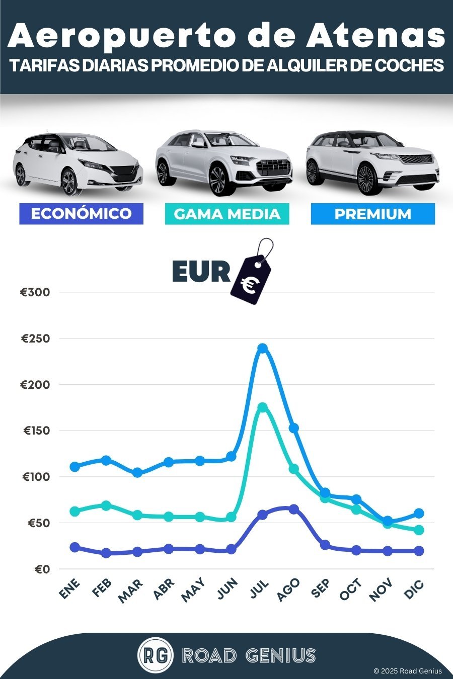 De media, el alquiler de coches en el Aeropuerto de Atenas cuesta alrededor de €71 al día, con los alquileres más baratos disponibles desde €17 al día.