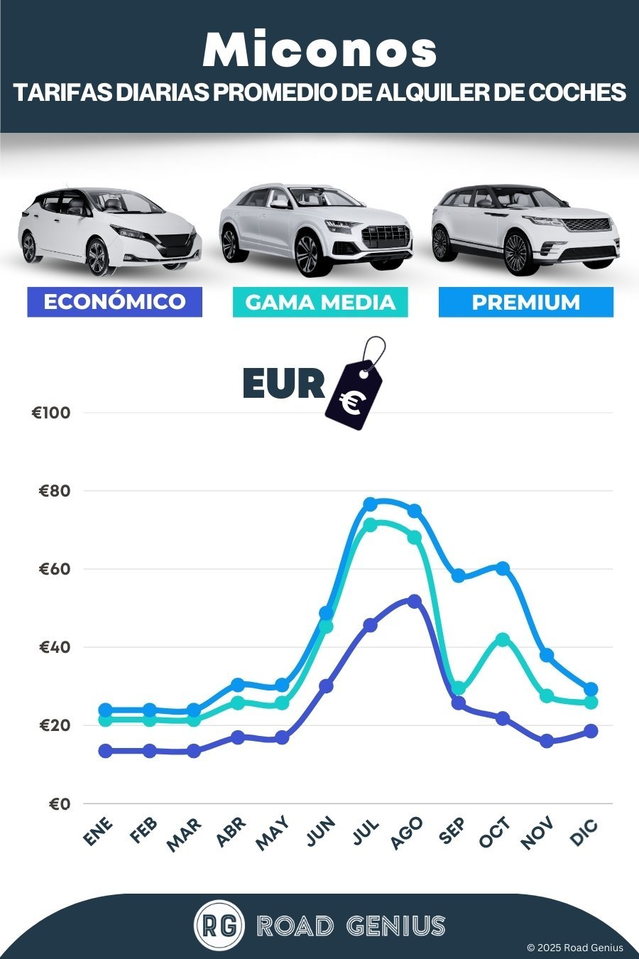 Alquilar un coche en Mykonos es muy sencillo con Road Genius. Compara precios de decenas de compañías de toda Grecia sin gastos de gestión. Puedes recoger tu coche de alquiler en el aeropuerto de Mykonos (JMK), en el puerto nuevo o en la ciudad de Mykonos. Elige un modelo compacto o automático, ideal para las carreteras estrechas de la isla. Si viajas en julio o agosto, reserva con antelación para conseguir mejores precios y asegurar disponibilidad.