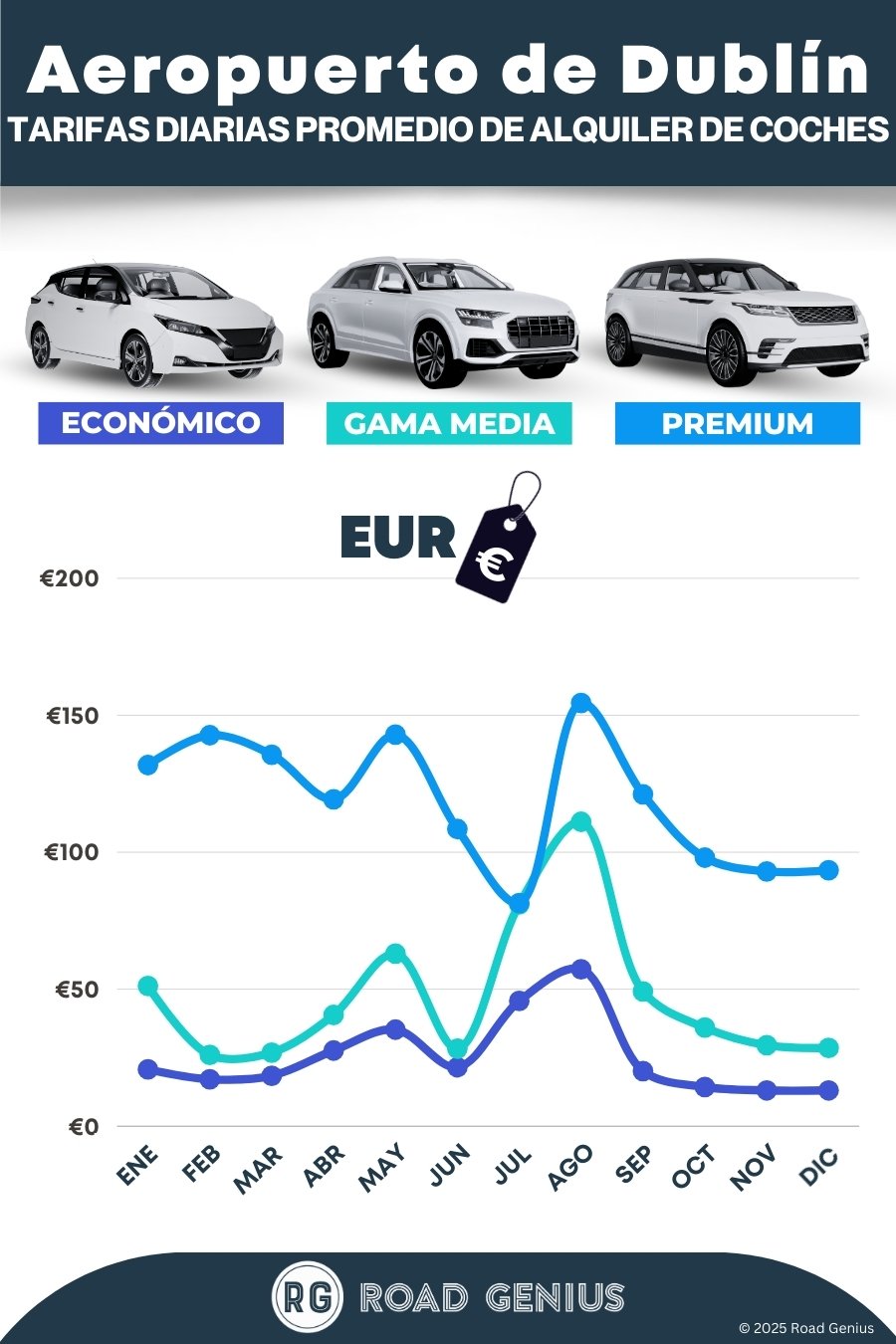 De media, el alquiler de coches en el Aeropuerto de Dublín cuesta alrededor de €64 al día, con los alquileres más baratos disponibles desde €13 al día.