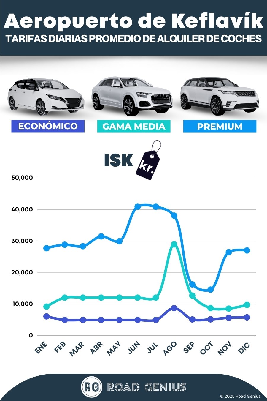 De media, el alquiler de coches en el Aeropuerto de Keflavík cuesta alrededor de 15.750 ISK al día, con los alquileres más baratos disponibles desde 4.973 ISK al día.