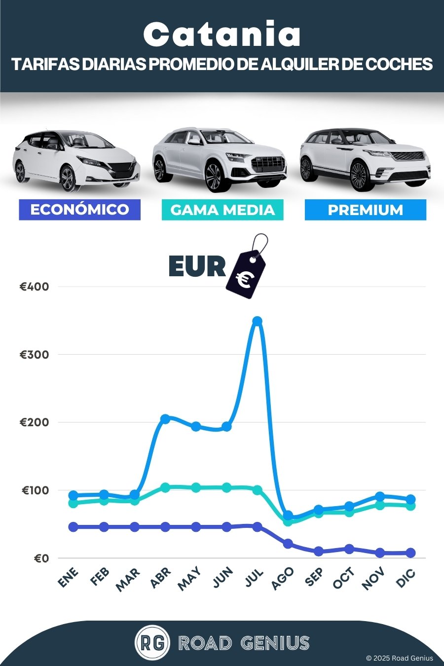 De media, el alquiler de coches en Catania cuesta alrededor de €83 al día, con los alquileres más baratos disponibles desde €8 al día.