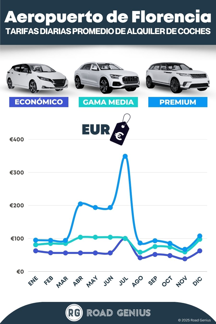 De media, el alquiler de coches en el Aeropuerto de Florencia cuesta alrededor de €94 al día, con los alquileres más baratos disponibles desde €38 al día.