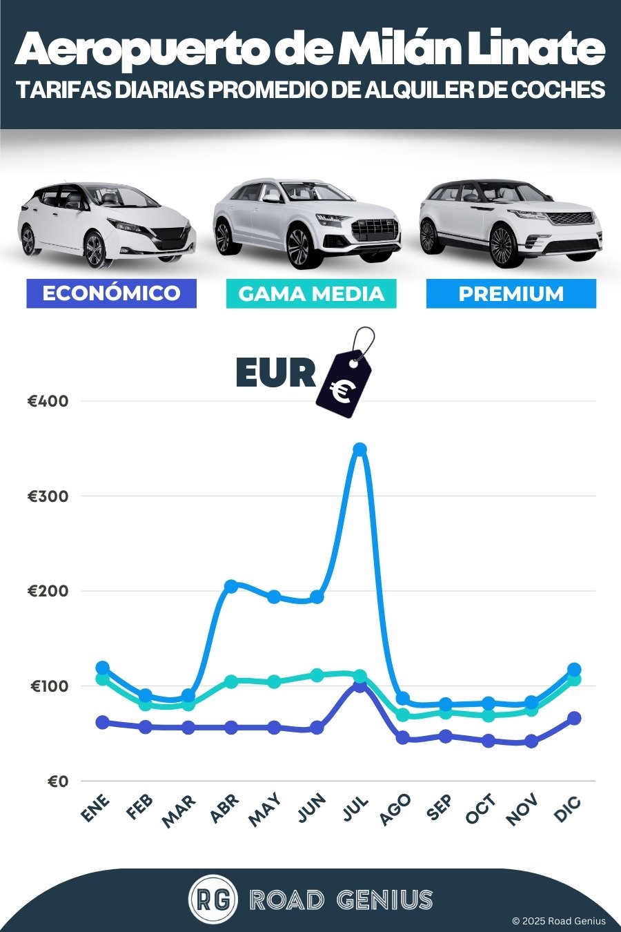 De media, el alquiler de coches en el Aeropuerto de Milán-Linate cuesta alrededor de €96 al día, con los alquileres más baratos disponibles desde €42 al día.