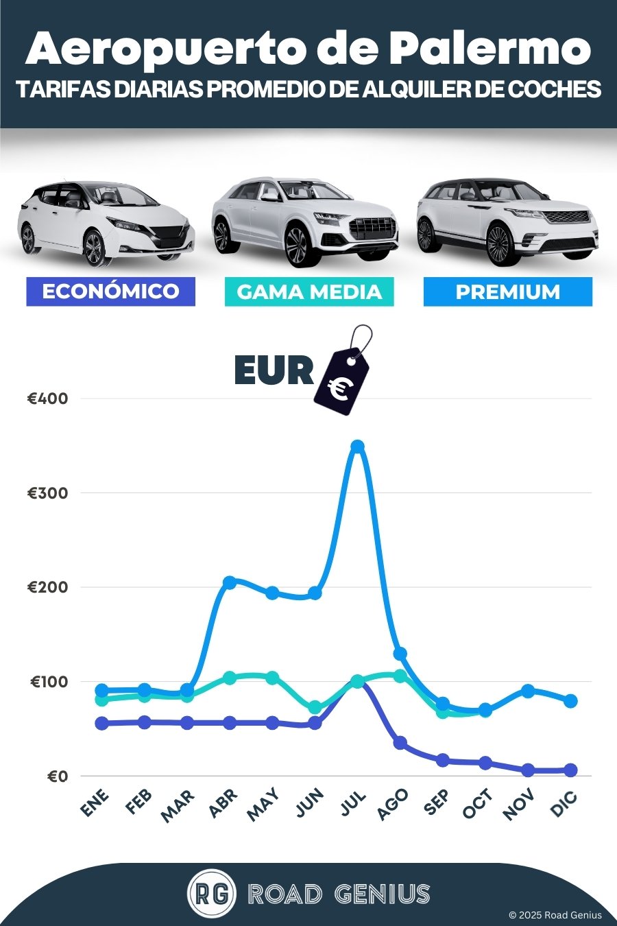 De media, el alquiler de coches en el Aeropuerto de Palermo cuesta alrededor de €89 al día, con los alquileres más baratos disponibles desde €6 al día.