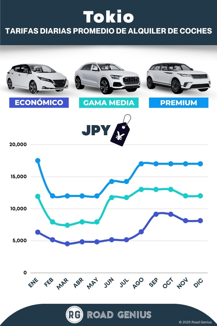De media, el alquiler de coches en Tokio cuesta alrededor de JP¥ 10.734 al día, con los alquileres más baratos disponibles desde JP¥ 4.546 al día.