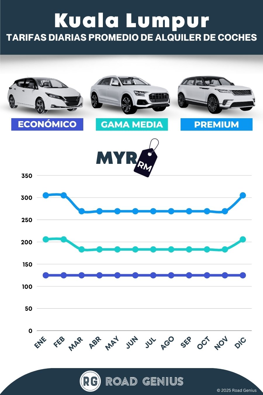 De media, el alquiler de coches en Kuala Lumpur cuesta alrededor de 276 MYR al día, con los alquileres más baratos disponibles desde 125 MYR al día.