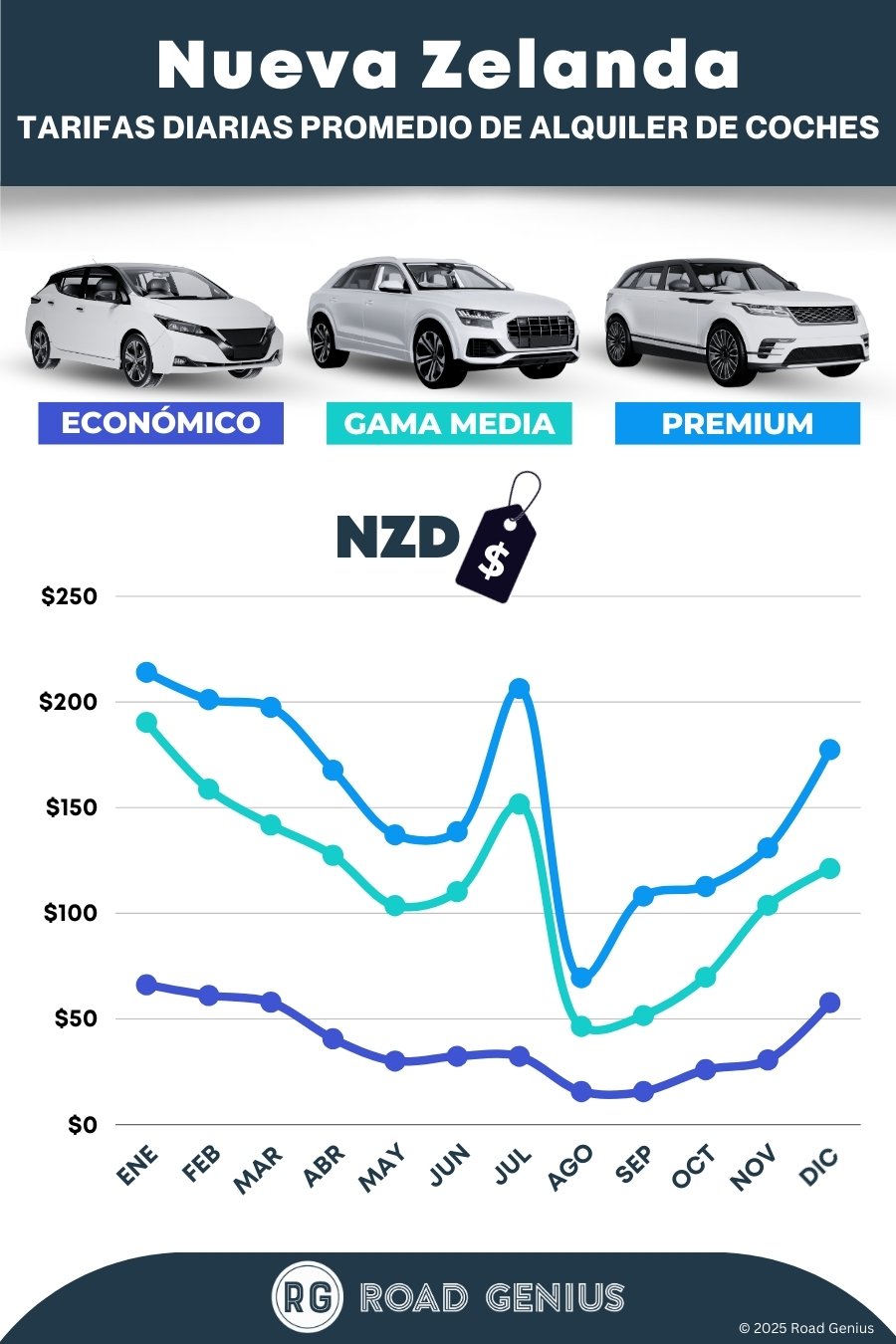 De media, el alquiler de coches en Nueva Zelanda cuesta alrededor de 103 NZD al día, con los alquileres más baratos disponibles desde 16 NZD al día.