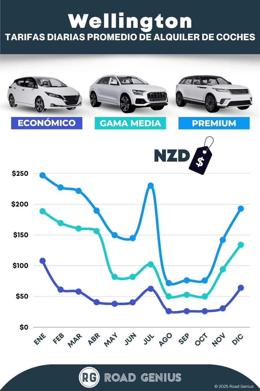 De media, el alquiler de coches en Wellington cuesta alrededor de 108 NZD al día, con los alquileres más baratos disponibles desde 26 NZD al día.