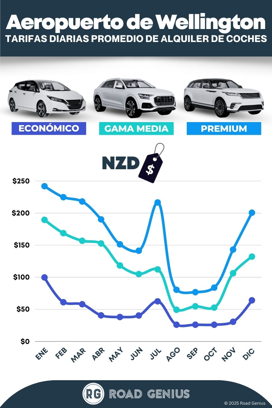 De media, el alquiler de coches en el Aeropuerto de Wellington cuesta alrededor de 109 NZD al día, con los alquileres más baratos disponibles desde 26 NZD al día.