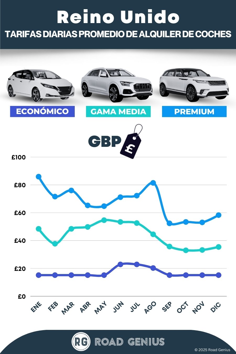 De media, el alquiler de coches en Reino Unido cuesta alrededor de €43 al día, con los alquileres más baratos disponibles desde €15 al día.