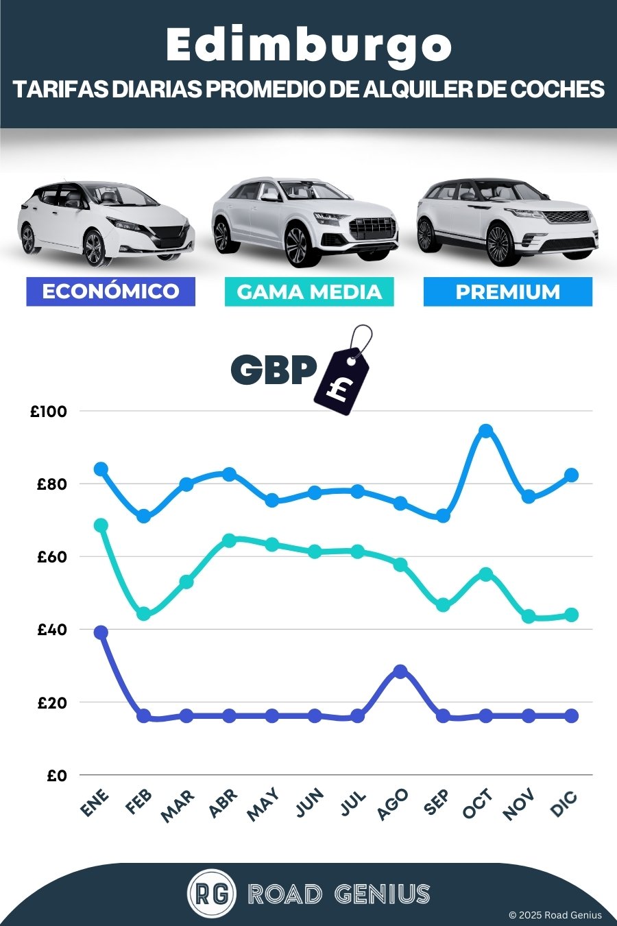 ¿Cuál es la mejor época para reservar un coche en Edimburgo? Para la temporada alta de verano, especialmente durante el Festival de agosto, reserva con al menos 2-3 meses de antelación. En épocas tranquilas suele bastar con 2-4 semanas antes.