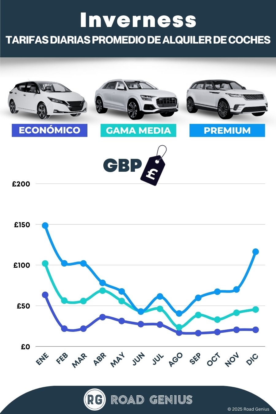 De media, el alquiler de coches en Inverness cuesta alrededor de €52 al día, con los alquileres más baratos disponibles desde €16 al día.