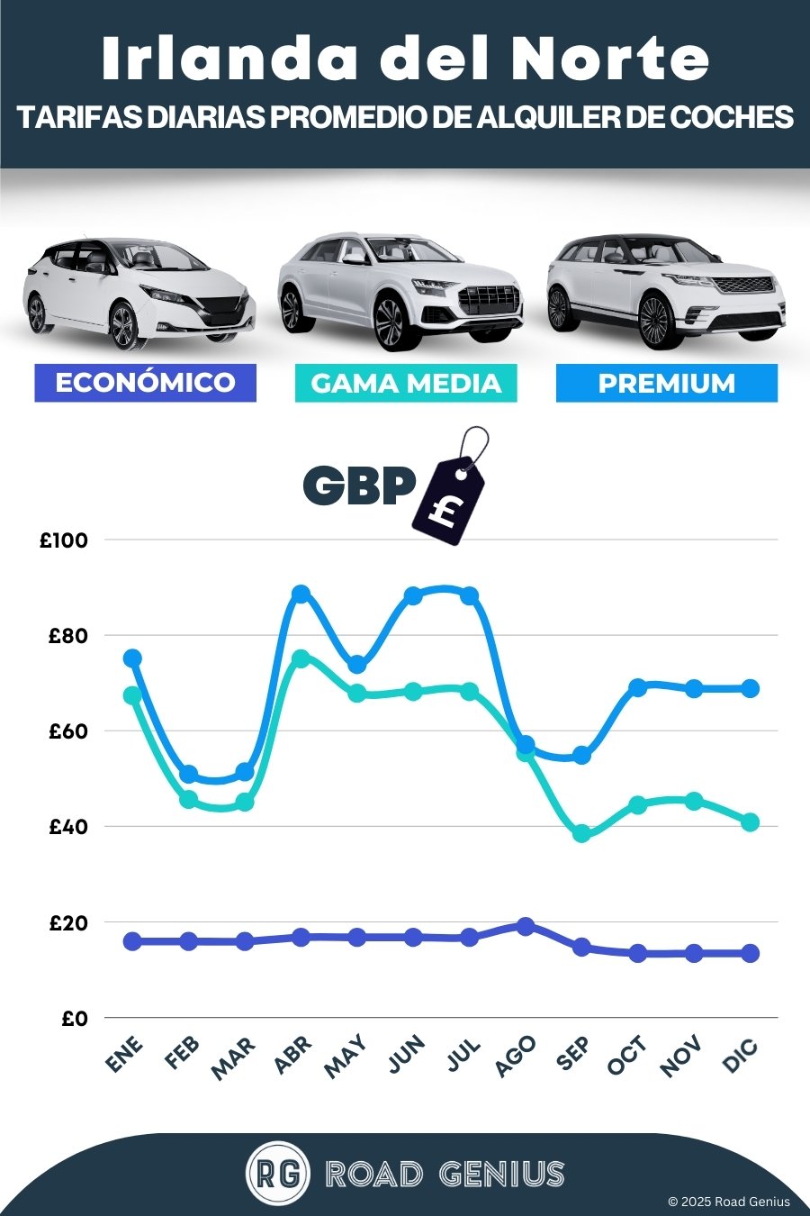 De media, el alquiler de coches en Irlanda del Norte cuesta alrededor de €47 al día, con los alquileres más baratos disponibles desde €13 al día.