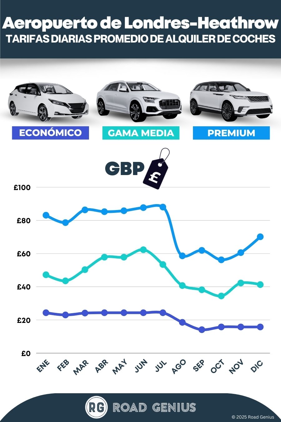 De media, el alquiler de coches en el Aeropuerto de Londres-Heathrow cuesta alrededor de €48 al día, con los alquileres más baratos disponibles desde €14 al día.