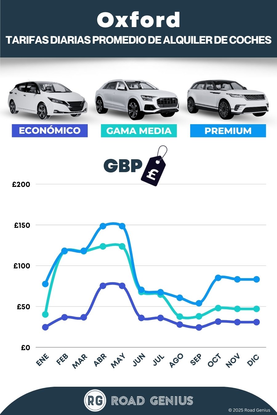 Compara oficinas y proveedores. Los precios varían entre el centro de Oxford, Kidlington (OXF) y Heathrow. Heathrow suele ser un 30 % más caro, y el centro se dispara en temporada alta. Oxford (OXF) puede ser más económico y menos concurrido.