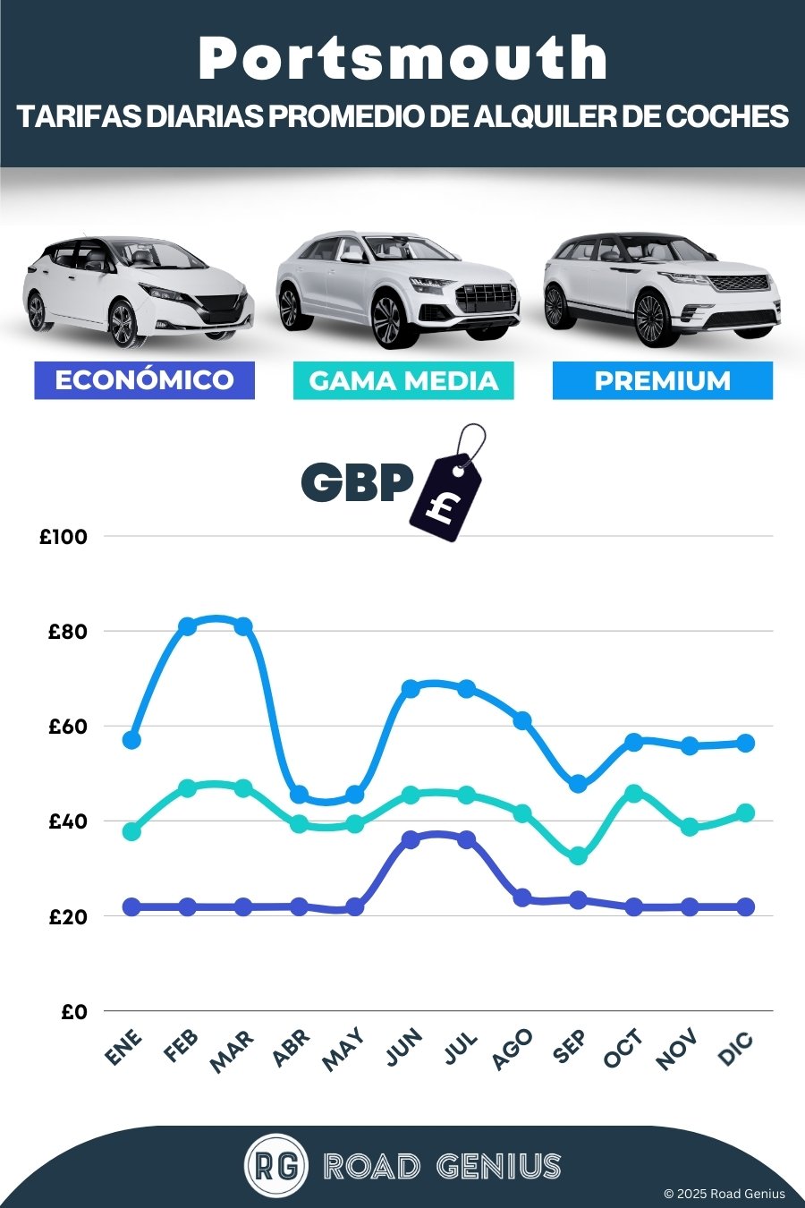 Aprovecha las tarifas semanales: Los alquileres semanales en Portsmouth son entre un 15 % y un 25 % más baratos por día que las reservas cortas. Si tu viaje lo permite, 7 días puede salir mejor que varios alquileres cortos.