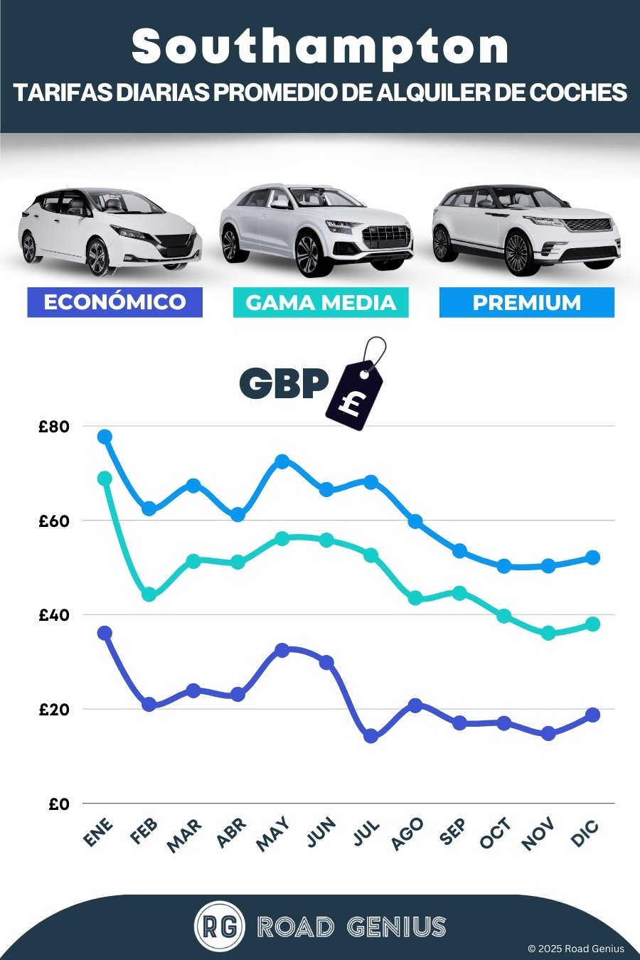 De media, el alquiler de coches en Southampton cuesta alrededor de €44 al día, con los alquileres más baratos disponibles desde €14 al día.