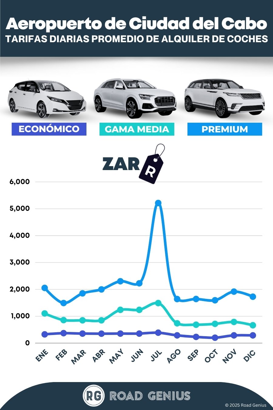 De media, el alquiler de coches en el Aeropuerto de Ciudad del Cabo cuesta alrededor de 1.129 ZAR al día, con los alquileres más baratos disponibles desde 201 ZAR al día.