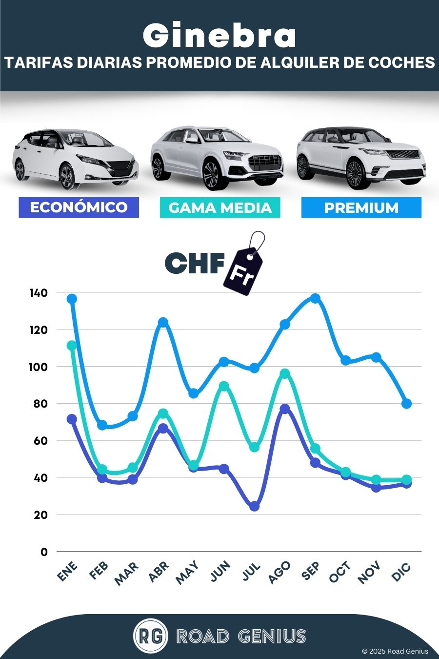De media, el alquiler de coches en Ginebra cuesta alrededor de 71 CHF al día, con los alquileres más baratos disponibles desde 24 CHF al día.