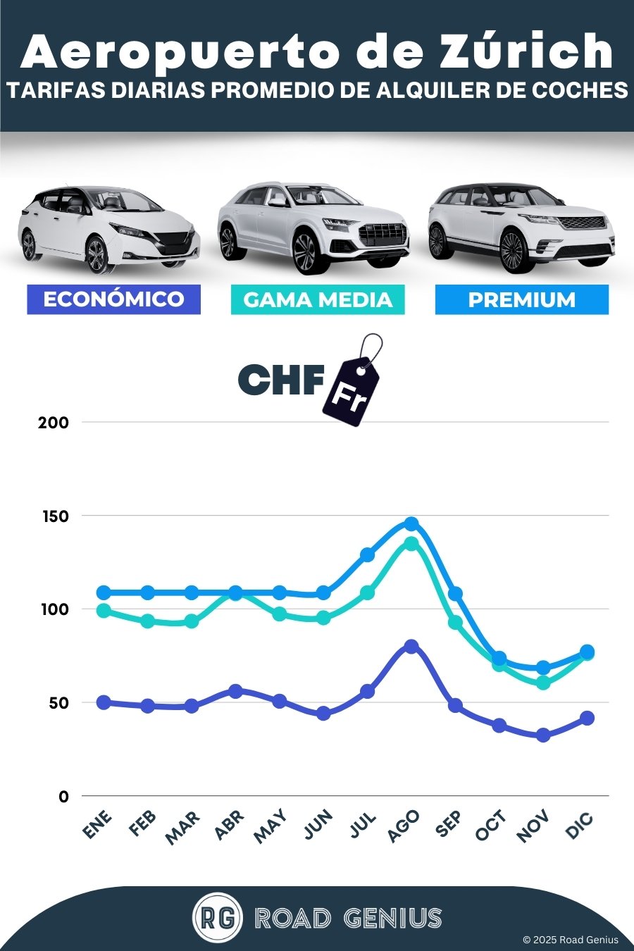 De media, el alquiler de coches en el Aeropuerto de Zúrich cuesta alrededor de 76 CHF al día, con los alquileres más baratos disponibles desde 25 CHF al día.