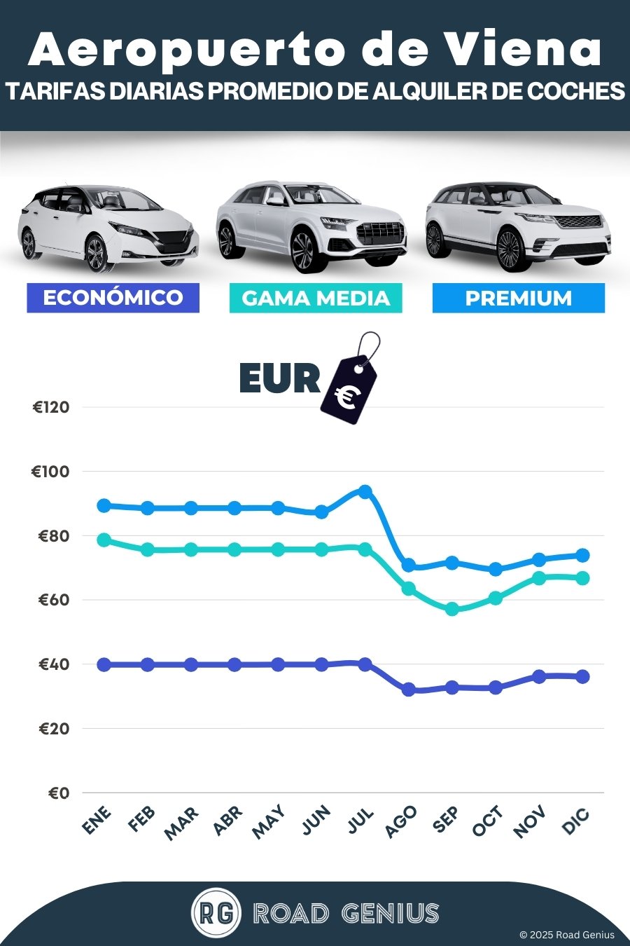 De media, el alquiler de coches en el Aeropuerto de Viena cuesta alrededor de €63 al día, con los alquileres más baratos disponibles desde €32 al día.