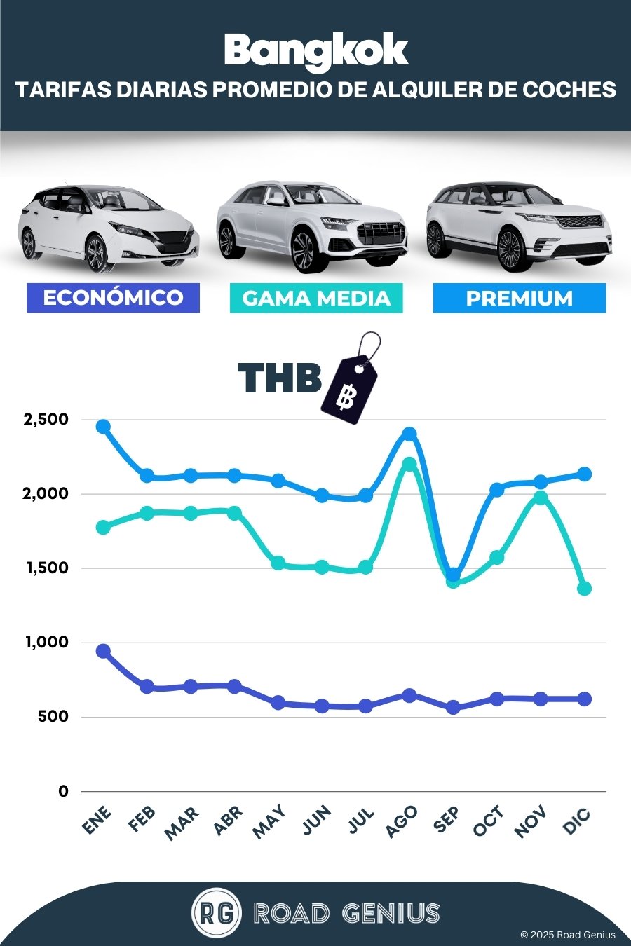 De media, el alquiler de coches en Bangkok cuesta alrededor de 2.150 THB al día, con los alquileres más baratos disponibles desde 566 THB al día.