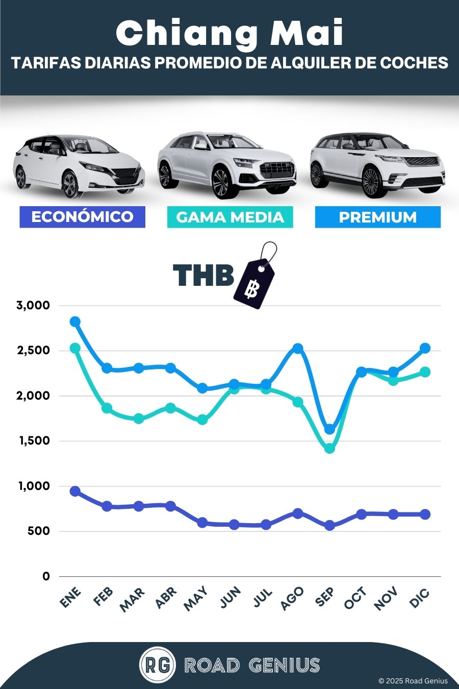 Encuentra los mejores precios para tu coche de alquiler en Chiang Mai con Road Genius. Compara tarifas en tiempo real para todoterrenos, coches compactos y monovolúmenes, y reserva sin comisiones. Recoge tu coche en el aeropuerto internacional de Chiang Mai o en las oficinas del centro, ya sea en el casco antiguo (Old City) o en la zona de Nimman, y pon rumbo a Doi Suthep, Doi Inthanon, Pai o Chiang Rai. Para la temporada alta, de noviembre a febrero, te recomendamos reservar con antelación para asegurarte mejores precios y mayor disponibilidad.