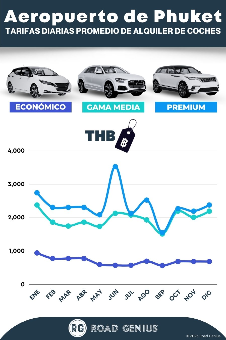 De media, el alquiler de coches en el Aeropuerto de Phuket cuesta alrededor de 1.676 THB al día, con los alquileres más baratos disponibles desde 566 THB al día.