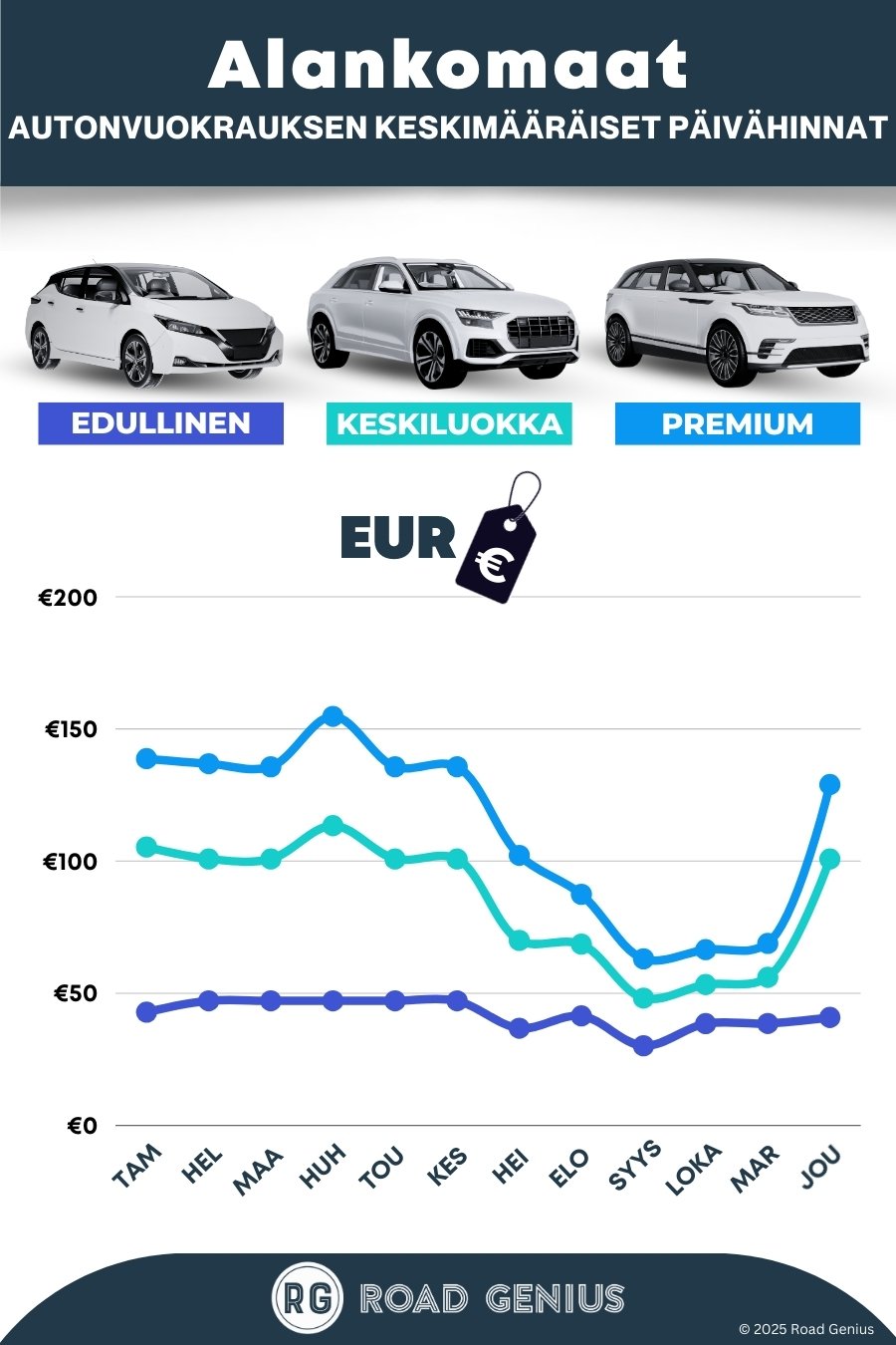 Keskimäärin autonvuokraus Alankomaissa maksaa noin 80 € päivässä, ja edullisimmat vuokraukset ovat saatavilla alkaen 30 € päivässä.